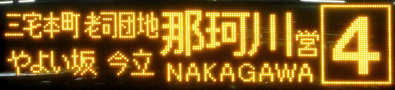 | 現存 |  | 行先: 4 那珂川営業所 経由地: 三宅本町,老司団地,やよい坂,今立 表示区間: 西鉄大橋駅→地禄神社 撮影日: 2019-11-25 公開日: 2020-06-04 撮影者: nnr_1510 備考: ローマ字表記あり(NAKAGAWA)