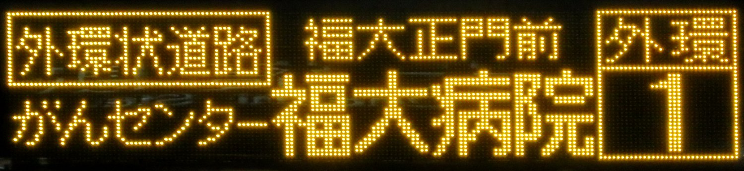 | 現存 |  | 行先: 1 外環 福大病院 経由地: 外環状道路,がんセンター,福大正門前 表示区間: 西鉄大橋駅→野多目小学校前 撮影日: 2019-11-25 公開日: 2020-05-31 撮影者: nnr_1510 備考: 「外環状道路」囲み表記/二段表記