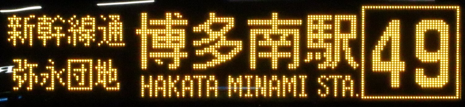 | 現存 |  | 行先: 49 博多南駅 経由地: 新幹線通,弥永団地 表示区間: 西鉄大橋駅→大橋本町 撮影日: 2019-11-25 公開日: 2020-06-01 撮影者: nnr_1510 備考: ローマ字表記あり(HAKATA MINAMI STA.)
