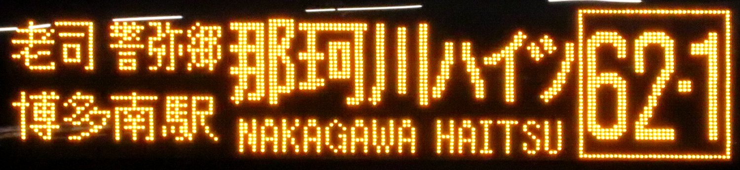 | 現存 |  | 行先: 62-1 那珂川ハイツ 経由地: 老司,警弥郷,博多南駅 表示区間: 西鉄大橋駅→老司 撮影日: 2019-11-25 公開日: 2020-06-01 撮影者: nnr_1510 備考: ローマ字表記あり(NAKAGAWA HAITSU)