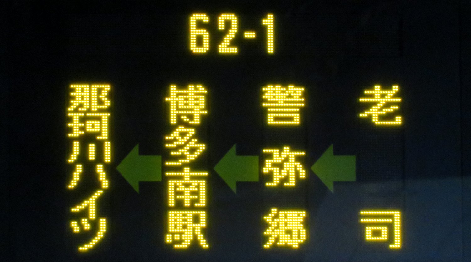| 現存 |  | 行先: 62-1 那珂川ハイツ 経由地: 老司,警弥郷,博多南駅 表示区間: 西鉄大橋駅→老司 撮影日: 2019-11-25 公開日: 2020-06-01 撮影者: nnr_1510 備考: