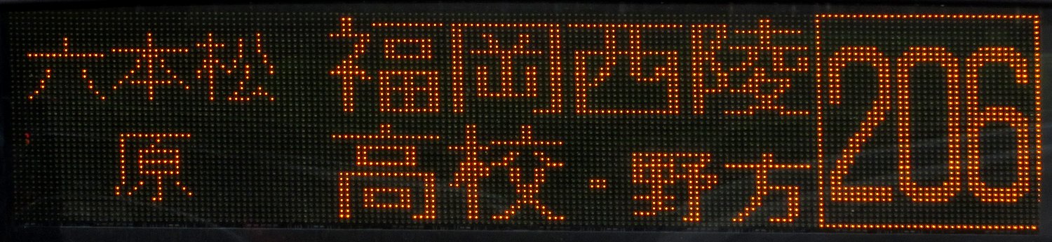 | 現存 |  | 行先: 206 野方(営業所) 経由地: 六本松,原,福岡西陵高校 表示区間: 那の津口(ボートレース福岡入口)→護国神社前 撮影日: 2019-11-16 公開日: 2020-05-26 撮影者: nnr_1510 備考: ◆中点表記/二段表記