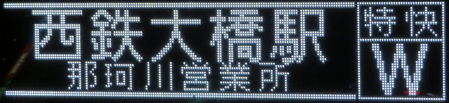 | 現存 |  | 行先: W 特快 那珂川営業所 経由地: 渡辺通一丁目,西鉄大橋駅,老司,片縄 表示区間: 天神ソラリアステージ前(7)のみ 撮影日: 2019-11-16 公開日: 2020-05-27 撮影者: nnr_1510 備考: ★夜3本のみ/福岡都心BRT/白色LED/中点表記/次停留所案内:次は天神大丸前