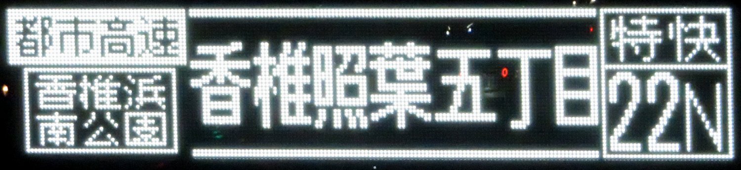 | 現存 |  | 行先: 22N 特快 香椎照葉五丁目 経由地: 都市高速,香椎浜南公園 表示区間: 天神中央郵便局前(18)→蔵本(昭和通)B 撮影日: 2019-11-16 公開日: 2020-05-28 撮影者: nnr_1510 備考: ★夜2本のみ/福岡都心BRT/白色LED/反転表示/「香椎浜南公園」囲み表記/上下ライン