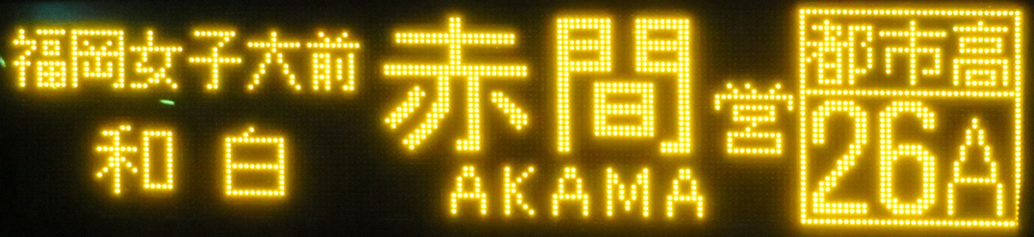 | 現存 |  | 行先: 26A 都市高 赤間営業所 経由地: 福岡女子大前,和白 表示区間: 天神中央郵便局前(18)→蔵本(昭和通) 撮影日: 2019-03-20 公開日: 2019-05-05 撮影者: nnr_1510 備考: