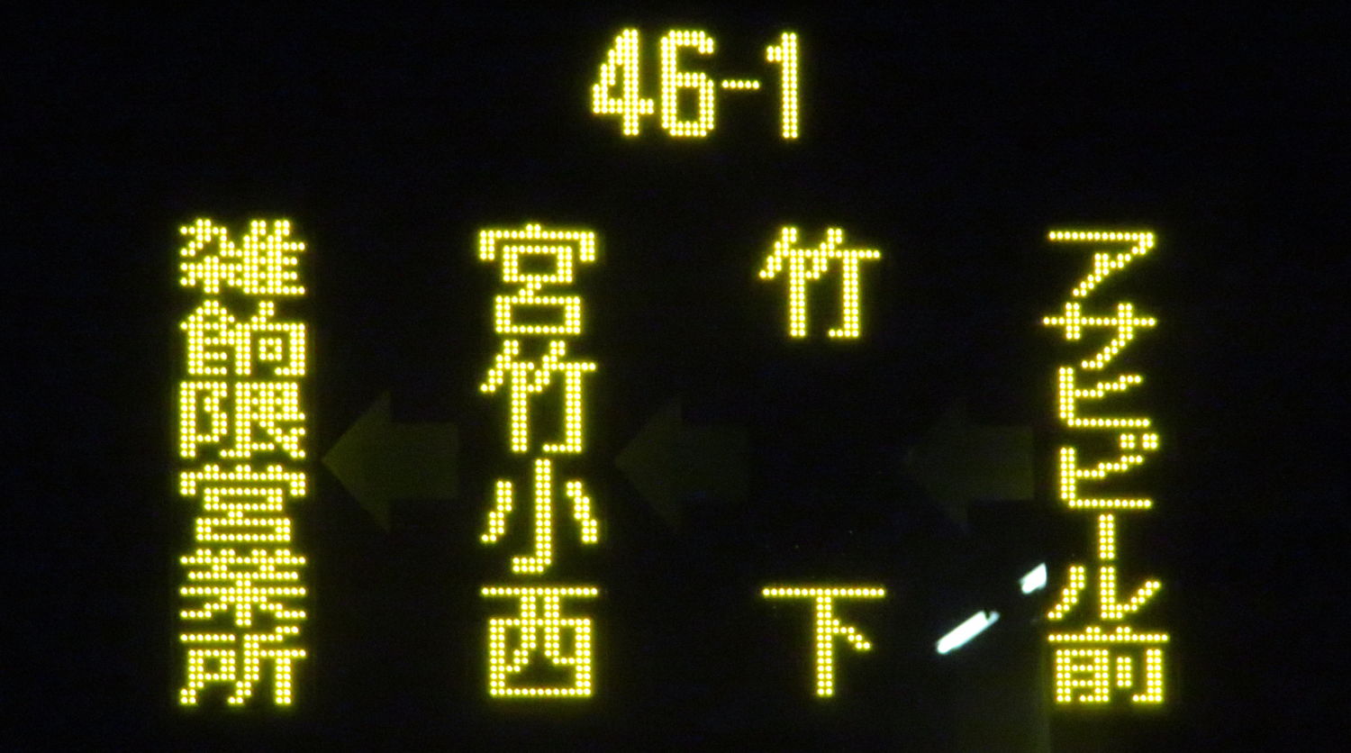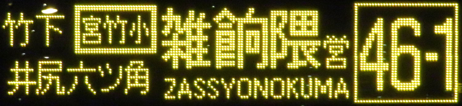 | 消滅 |  | 行先: 46-1 雑餉隈営業所 経由地: 竹下,宮竹小,井尻六ツ角 表示区間: 春住町→アサヒビール前 撮影日: 2019-12-02 公開日: 2020-06-20 撮影者: nnr_1510 備考: 「宮竹小」囲み表記/ローマ字表記あり(ZASSYONOKUMA)/2020.03.21改正で消滅(雑餉隈営業所改称に伴い)