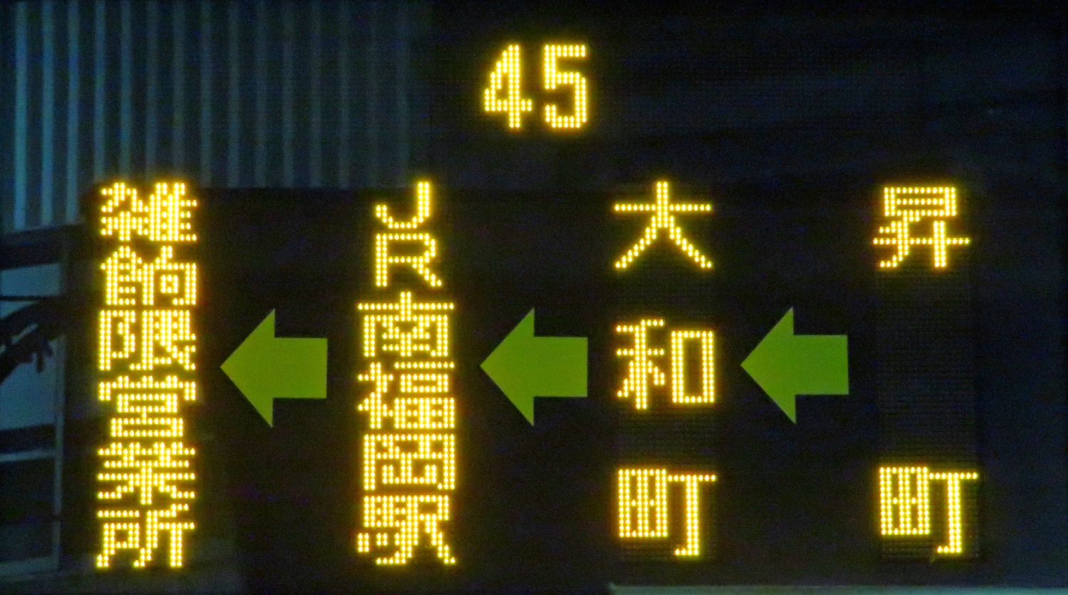 | 消滅 |  | 行先: 45 雑餉隈営業所 経由地: 昇町,大和町,JR南福岡駅 表示区間: 井尻駅(踏切)/福岡女学院→昇町いきいきプラザ前 撮影日: 2019-12-02 公開日: 2021-03-24 撮影者: nnr_1510 備考: 2020.03.21改正で消滅(雑餉隈営業所改称に伴い)