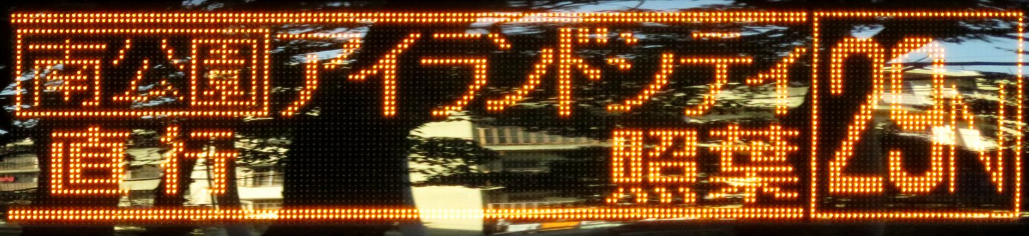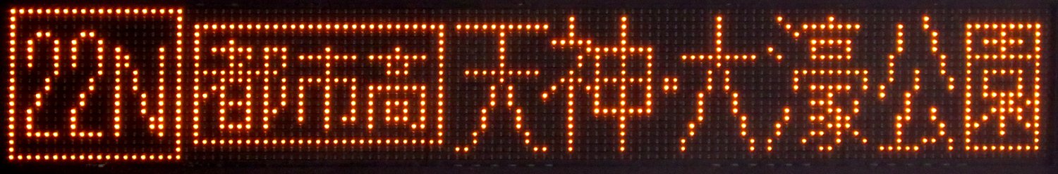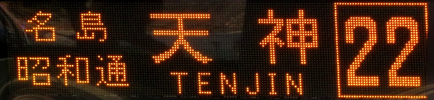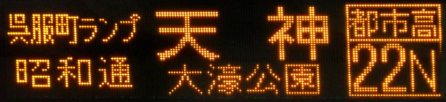 | 現存 |  | 行先: 22N 都市高 大濠公園 経由地: 天神 表示区間: アイランドシティ照葉/香椎浜車庫→名島運動公園前 撮影日: 2019-11-16 公開日: 2020-05-24 撮影者: nnr_1510 備考: 中点表記