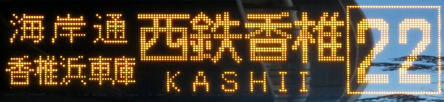 | 現存 |  | 行先: 22 天神三丁目(15) 経由地: 表示区間: 全区間(西鉄香椎→天神三丁目(15)) 撮影日: 2019-11-16 公開日: 2020-05-24 撮影者: nnr_1510 備考: ★★平日早朝1本・土曜2本のみ