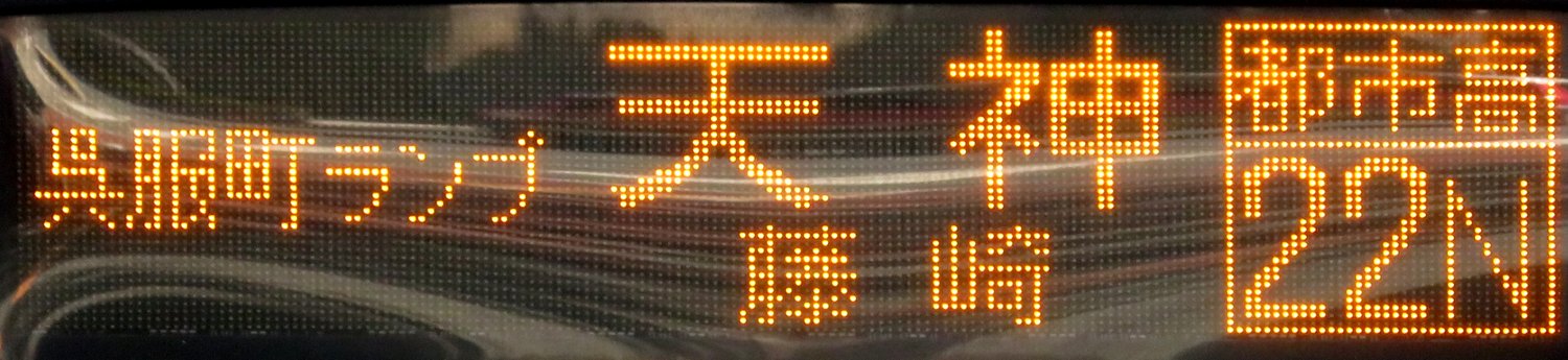 | 現存 |  | 行先: 22N 都市高 大濠公園 経由地: 呉服町ランプ,昭和通,天神 表示区間: 福岡運輸支局前→名島運動公園前 撮影日: 2019-11-16 公開日: 2020-05-24 撮影者: nnr_1510 備考: ■27N連続運行便のみ表示