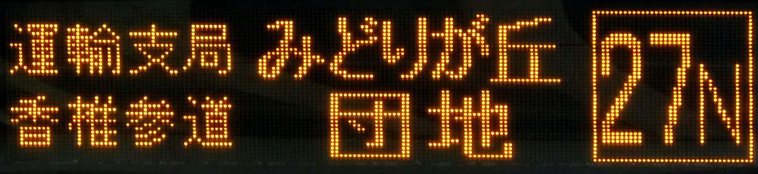 | 現存 |  | 行先: 27N みどりが丘団地入口 経由地: 運輸支局,香椎参道 表示区間: 名島運動公園前→香椎浜一丁目 撮影日: 2019-11-16 公開日: 2020-05-24 撮影者: nnr_1510 備考: