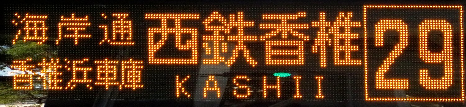 | 現存 |  | 行先: 29 西鉄香椎 経由地: 海岸通,香椎浜車庫 表示区間: 城浜団地→イオンモール香椎浜 撮影日: 2019-11-16 公開日: 2020-05-23 撮影者: nnr_1510 備考: ●香椎浜海岸通り通過後も表示不変/ローマ字表記あり(KASHII)