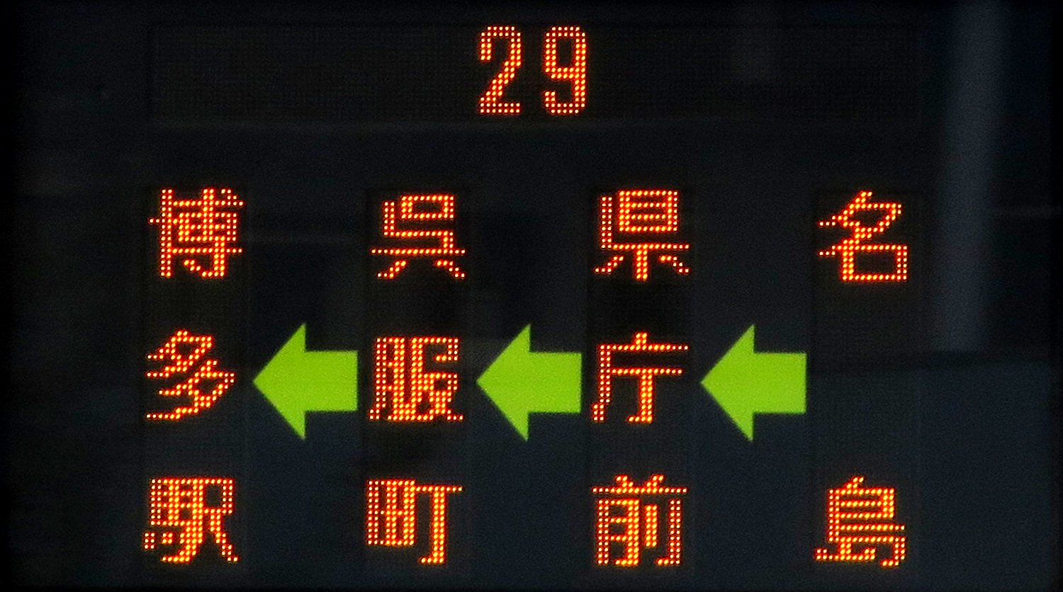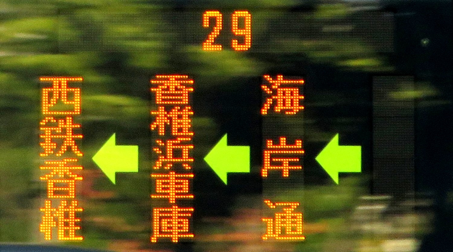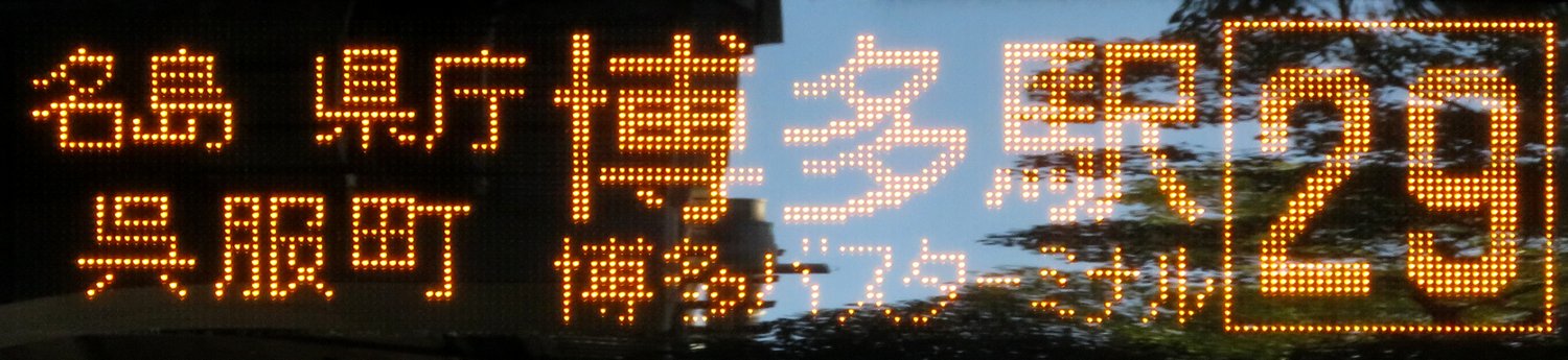 | 現存 |  | 行先: 29N 都市高 直行 博多バスターミナル1F 経由地: 表示区間: アイランドシティ照葉→名島運動公園前 撮影日: 2019-11-16 公開日: 2020-05-24 撮影者: nnr_1510 備考: 直行便/「博多バスターミナル」表記なし(「博多駅」表記)
