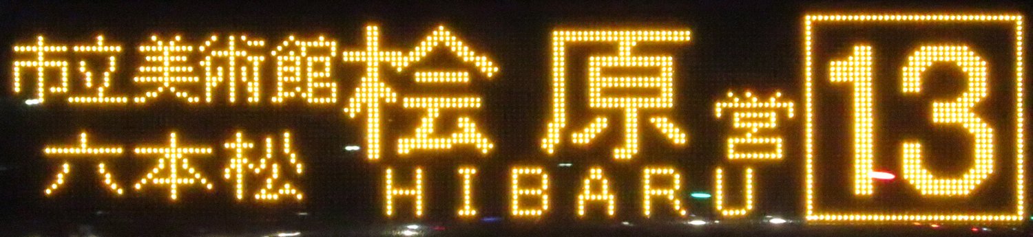 | 現存 |  | 行先: 13 桧原営業所 経由地: 市立美術館,六本松 表示区間: 天神大和証券前(12)→大手門・平和台陸上競技場入口 撮影日: 2019-11-12 公開日: 2020-05-18 撮影者: nnr_1510 備考: 桧原営業所運行便/ローマ字表記あり(HIBARU)