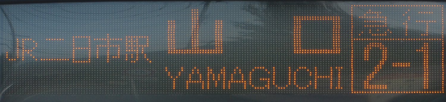 | 現存 |  | 行先: 2-1 急行 山口 経由地: JR二日市駅 表示区間: 全区間(西鉄二日市→山口) 撮影日: 2019-08-17 公開日: 2020-05-17 撮影者: nnr_1510 備考: ★★早朝1本のみ/ローマ字表記あり(YAMAGUCHI)