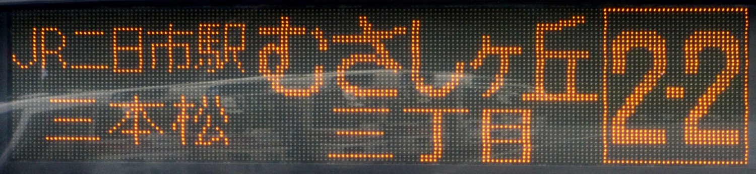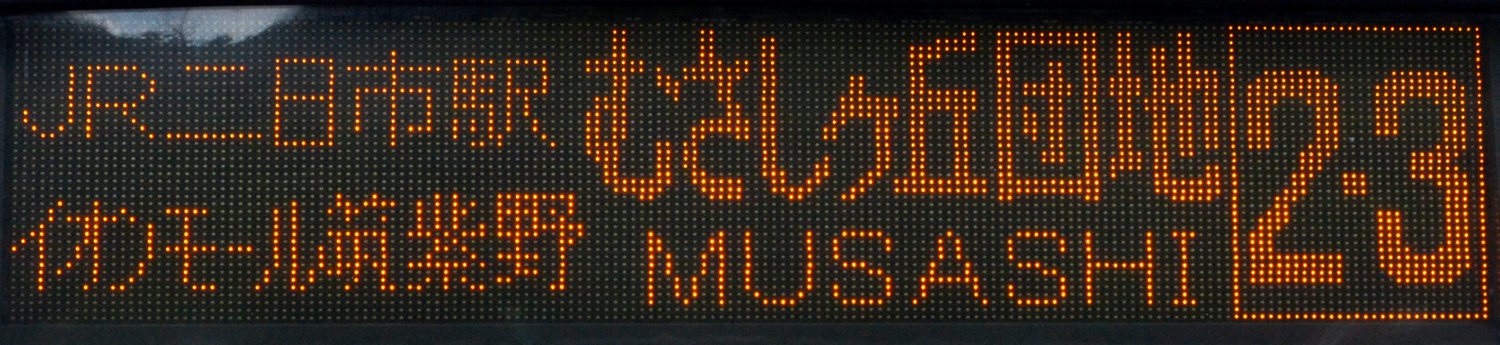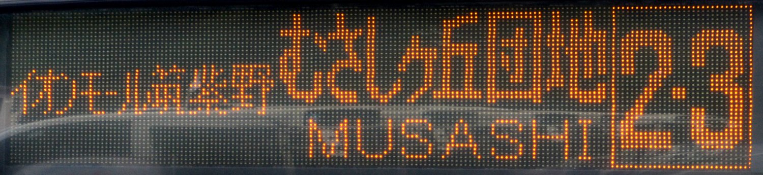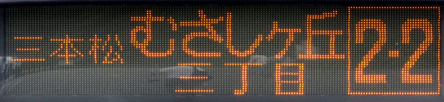 | 消滅 |  | 行先: 2-3 むさしヶ丘団地 経由地: JR二日市駅,イオンモール筑紫野 表示区間: 西鉄二日市のみ 撮影日: 2019-08-17 公開日: 2020-05-17 撮影者: nnr_1510 備考: ローマ字表記あり(MUSASHI)/2017.08.26改正で廃止(むさしヶ丘三丁目延伸に伴い)