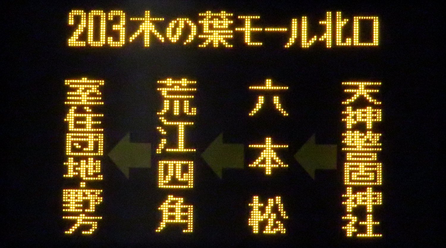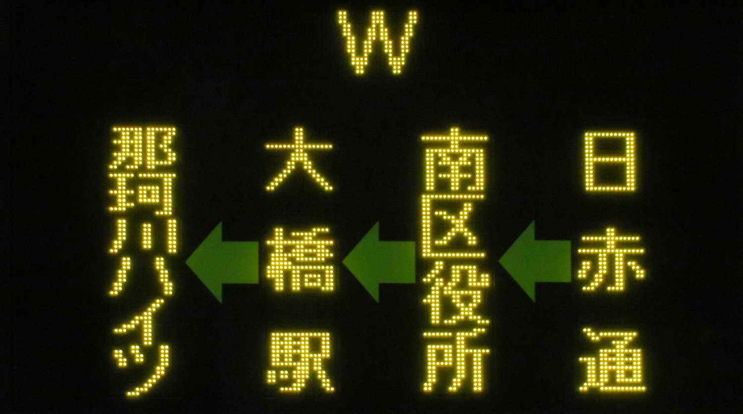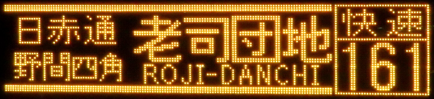 | 現存 |  | 行先: 161 快速 老司団地(1) 経由地: 日赤通,野間四角 表示区間: 天神北(9)/天神大和証券前(12)→渡辺通一丁目FM福岡前D 撮影日: 2019-06-19 公開日: 2020-05-16 撮影者: nnr_1510 備考: 上下ライン/ローマ字表記あり(ROJI-DANCHI)