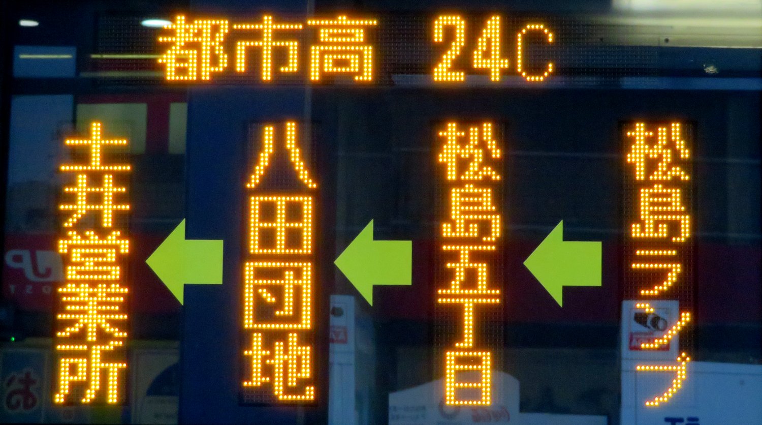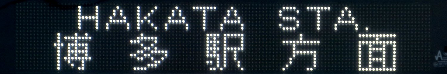 | 現存 |  | 行先: 無番 博多駅方面(→博多港国際ターミナル(中央ふ頭)) 経由地: 渡辺通一丁目,博多駅方面 表示区間: 天神ソラリアステージ前(7)のみ 撮影日: 2019-06-19 公開日: 2020-05-16 撮影者: nnr_1510 備考: 福岡都心BRT/白色LED/方面表記/ローマ字表記あり(HAKATA STA.)/韓国語表記あり(하카타 역:博多駅)