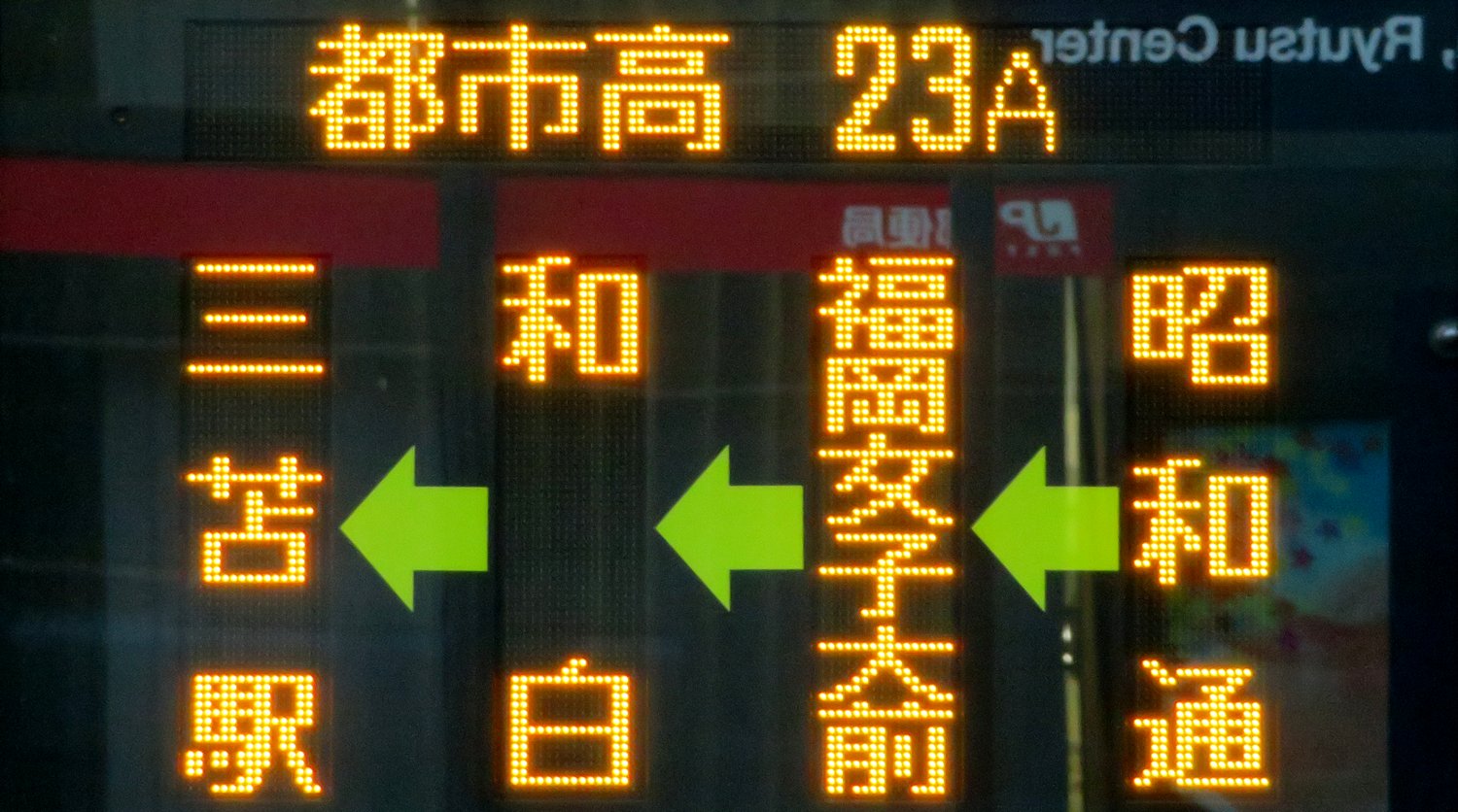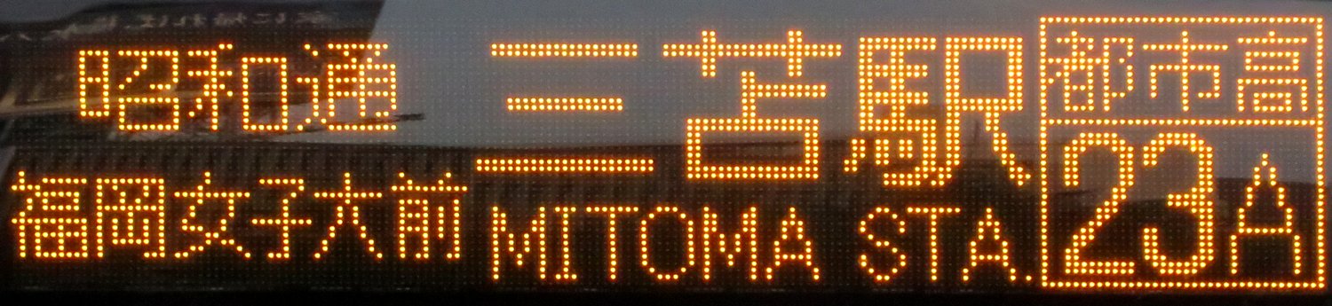 | 現存 |  | 行先: 23A 都市高 西鉄三苫駅 経由地: 昭和通,福岡女子大前 表示区間: 天神中央郵便局前(18)→博多五町 撮影日: 2019-06-19 公開日: 2020-05-16 撮影者: nnr_1510 備考: ローマ字表記あり(MITOMA STA.)