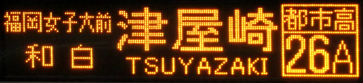 | 現存 |  | 行先: 26A 都市高 津屋崎 経由地: 福岡女子大前,和白 表示区間: 天神中央郵便局前(18)→蔵本(昭和通)B 撮影日: 2019-06-14 公開日: 2020-05-16 撮影者: nnr_1510 備考: ★ローマ字表記あり(TSUYAZAKI)