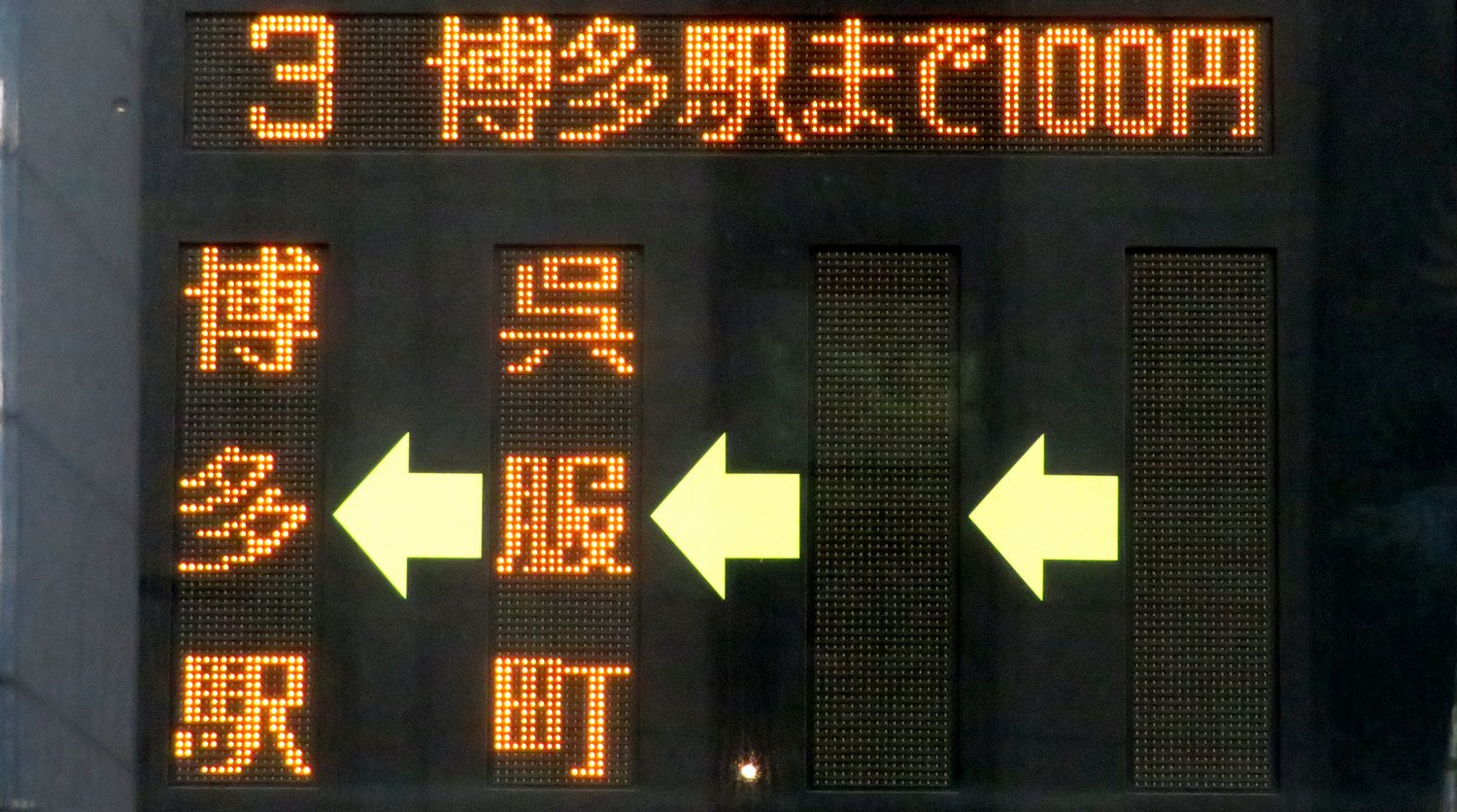 | 現存 |  | 行先: 3 博多駅新三井ビル前 経由地: 呉服町 表示区間: 川端町・博多座前→博多駅新三井ビル前 撮影日: 2019-06-19 公開日: 2020-05-16 撮影者: nnr_1510 備考: ■「博多駅まで100円」表記/博多・早良・片江営業所運行便のみ表示(片江は2020.03.21改正から)/早良・片江便は2020.03.21改正より呉服町(博多駅方面)Iから別表示あり