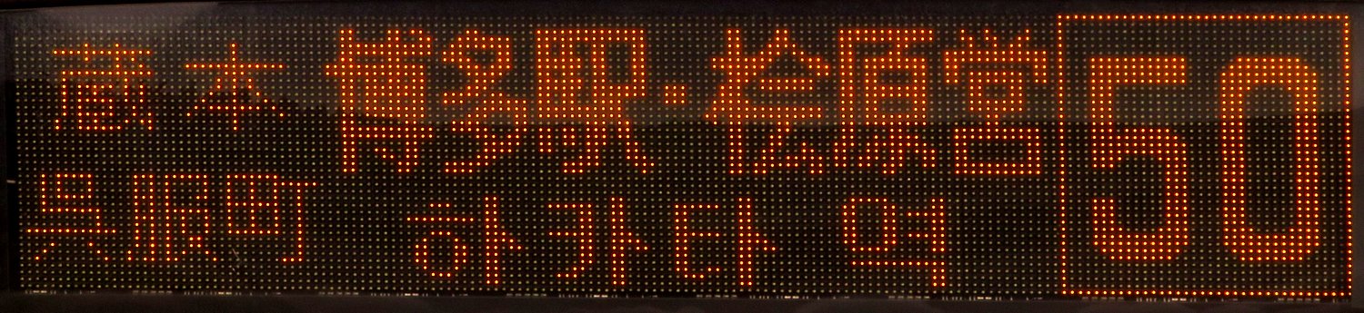 | 現存 |  | 行先: 50 桧原営業所 経由地: 蔵本,呉服町,博多駅 表示区間: 博多港国際ターミナル(中央ふ頭)→国際会議場サンパレス前 撮影日: 2019-06-19 公開日: 2020-05-16 撮影者: nnr_1510 備考: 中点表記/韓国語表記あり(하카타 역:博多駅)
