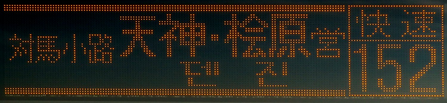 | 現存 |  | 行先: 152 快速 桧原営業所 経由地: 対馬小路,天神 表示区間: 中央ふ頭クルーズセンター→国際センター・サンパレス前 撮影日: 2019-06-19 公開日: 2020-05-16 撮影者: nnr_1510 備考: ふ頭始発系統/中点表記/韓国語表記あり(덴진:天神)/上下ライン