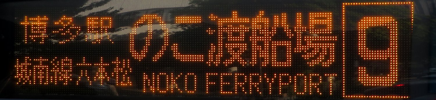| 現存 |  | 行先: 9 能古渡船場 経由地: 博多駅,城南線,六本松 表示区間: 呉服町(博多駅方面)I→駅前一丁目 撮影日: 2019-06-13 公開日: 2020-05-12 撮影者: nnr_1510 備考: 後日再撮影予定(角度悪)/ローマ字表記あり(NOKO FERRYPORT)