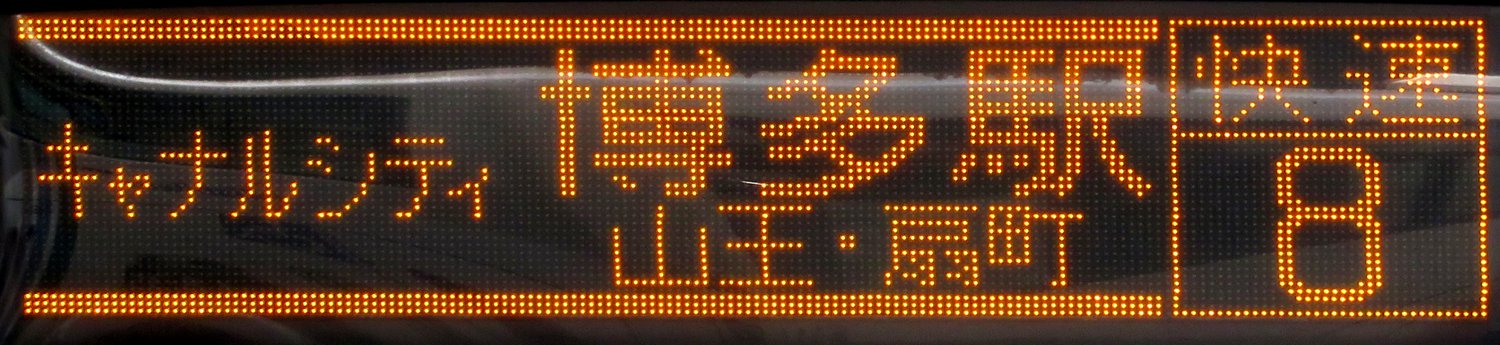 | 現存 |  | 行先: 8 快速 扇町 経由地: キャナルシティ,博多駅,山王 表示区間: 天神警固神社・三越前?→博多バスターミナル1F 撮影日: 2019-06-13 公開日: 2020-05-12 撮影者: nnr_1510 備考: ★中点表記/次の博多駅筑紫口より各停8番として運行