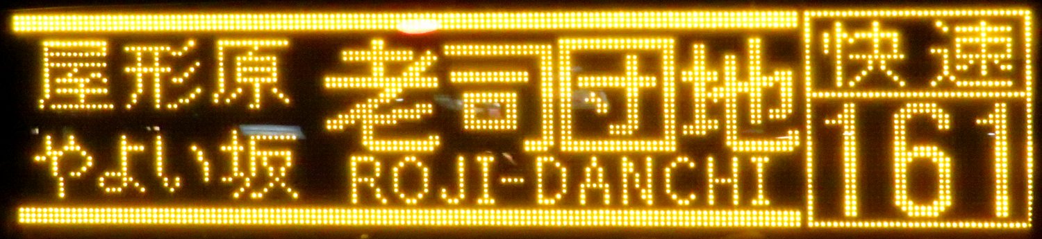 | 現存 |  | 行先: 161 快速 老司団地(1) 経由地: 屋形原,やよい坂 表示区間: 野間四角→緑園前 撮影日: 2019-06-07 公開日: 2020-05-11 撮影者: nnr_1510 備考: 上下ライン/ローマ字表記あり(ROJI-DANCHI)