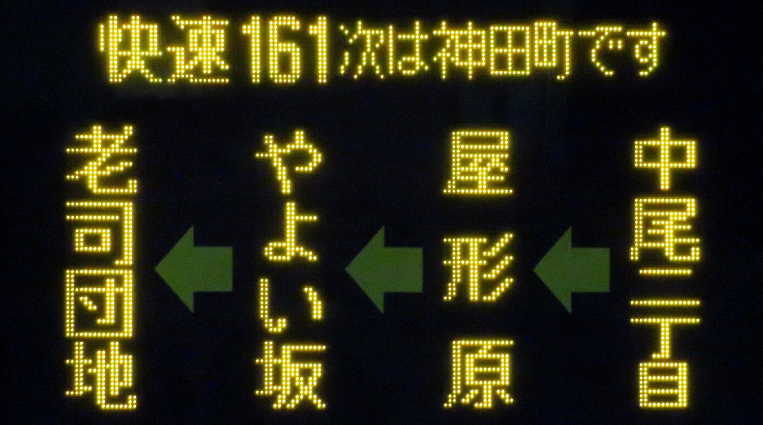 | 現存 |  | 行先: 161 快速 老司団地(1) 経由地: 中尾二丁目,屋形原,やよい坂 表示区間: 野間四角のみ 撮影日: 2019-06-07 公開日: 2020-05-11 撮影者: nnr_1510 備考: 次停留所案内:次は神田町です