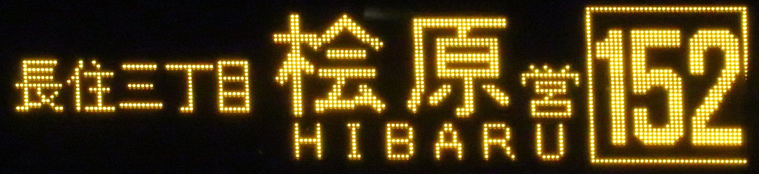 | 現存 |  | 行先: 152 桧原営業所 経由地: 長住三丁目 表示区間: 野間四角→桧原営業所 撮影日: 2019-06-07 公開日: 2020-05-11 撮影者: nnr_1510 備考: ■福岡タワー始発系統のみ表示/ローマ字表記あり(HIBARU)