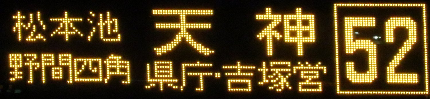 | 現存 |  | 行先: 152 快速 博多港国際ターミナル(中央ふ頭) 経由地: 長住三丁目,野間四角,日赤通,天神 表示区間: 桧原営業所→松本池 撮影日: 2019-06-07 公開日: 2020-05-10 撮影者: nnr_1510 備考: 中点表記