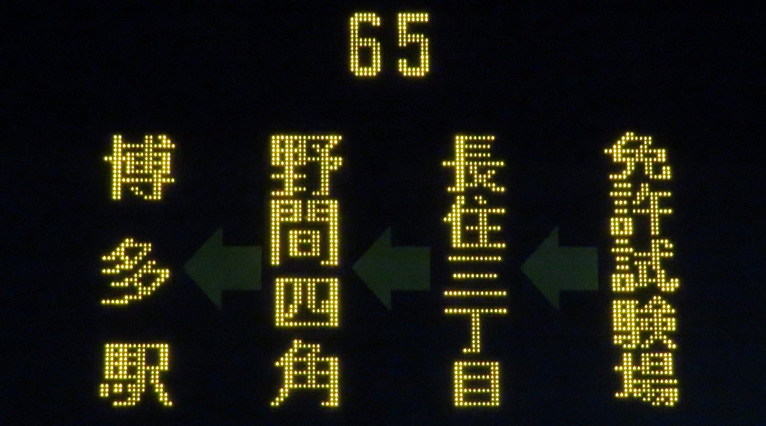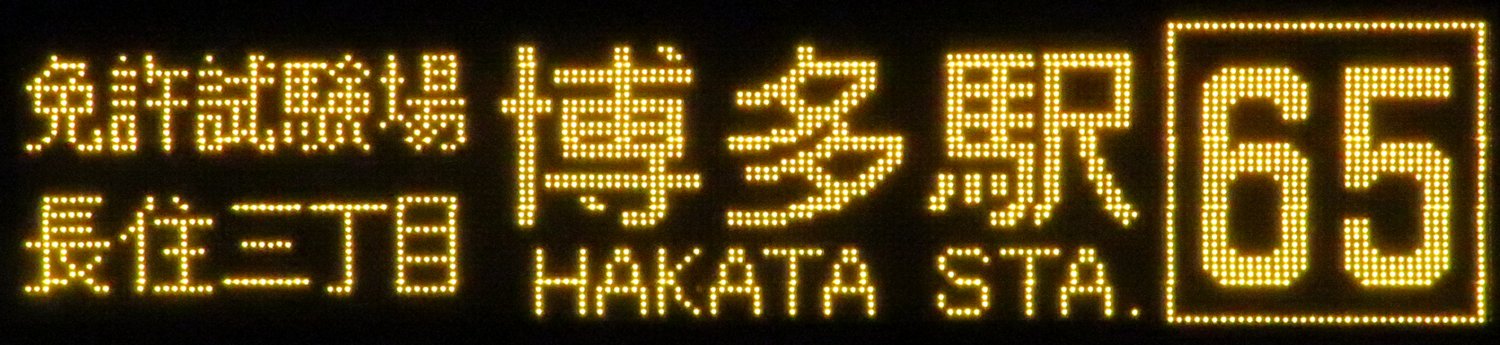 | 現存 |  | 行先: 65 博多駅西日本シティ銀行前F 経由地: 免許試験場,長住三丁目 表示区間: 桧原営業所→柏原 撮影日: 2019-06-07 公開日: 2020-05-10 撮影者: nnr_1510 備考: ローマ字表記あり(HAKATA STA.)