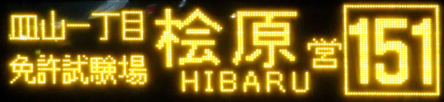 | 現存 |  | 行先: 151 桧原営業所 経由地: 皿山一丁目,免許試験場 表示区間: 野間四角→桧原営業所 撮影日: 2019-06-07 公開日: 2020-05-10 撮影者: nnr_1510 備考: ローマ字表記あり(HIBARU)