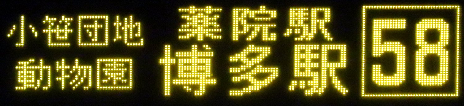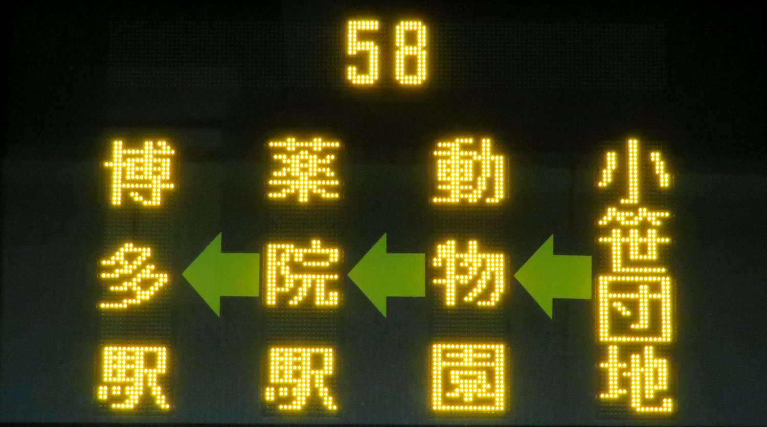 | 現存 |  | 行先: 58 博多駅西日本シティ銀行前F 経由地: 小笹団地,動物園,薬院駅 表示区間: 桧原営業所→小笹南口 撮影日: 2019-06-07 公開日: 2020-05-10 撮影者: nnr_1510 備考: 二段表記