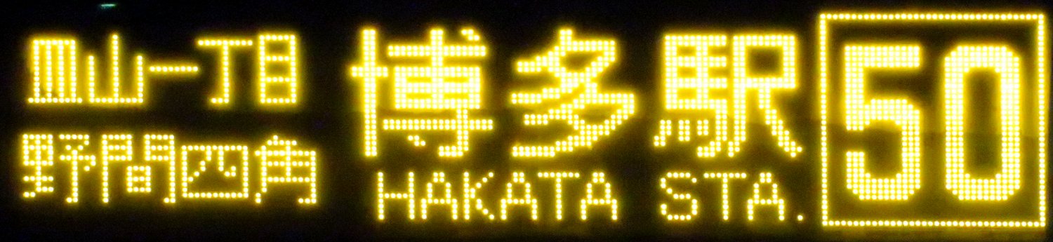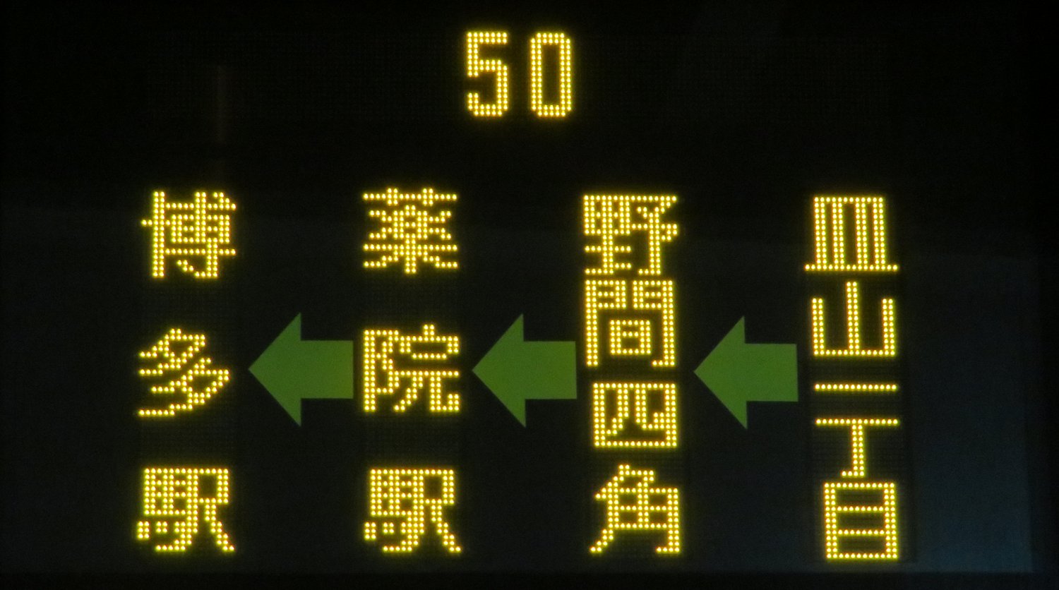 | 現存 |  | 行先: 50 博多駅西日本シティ銀行前F 経由地: 皿山一丁目,野間四角 表示区間: 桧原営業所→柏原 撮影日: 2019-06-07 公開日: 2020-05-10 撮影者: nnr_1510 備考: ローマ字表記あり(HAKATA STA.)
