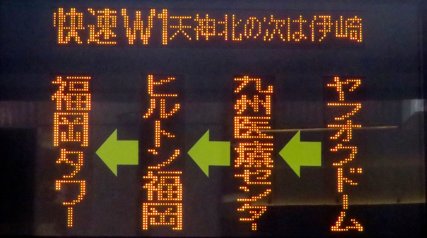 | 消滅 |  | 行先: W1 快速 福岡タワー(TNC放送会館) 経由地: ヤフオクドーム,九州医療センター,ヒルトン福岡 表示区間: 天神高速バスターミナル前(1)のみ 撮影日: 2019-05-30 公開日: 2020-05-08 撮影者: nnr_1510 備考: ◆次停留所案内:天神北の次は伊崎/2020.03.21改正で消滅(ヤフオクドーム改称に伴い)