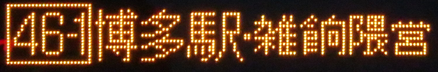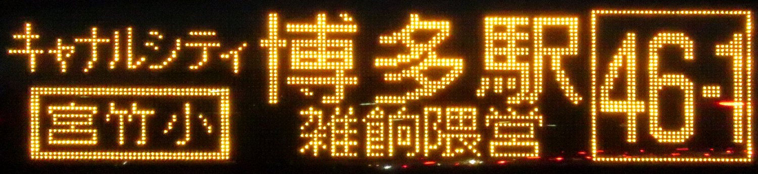 | 消滅 |  | 行先: 46-1 雑餉隈営業所 経由地: キャナルシティ,宮竹小,博多駅 表示区間: 春吉→中洲・南新地 撮影日: 2019-05-30 公開日: 2020-05-08 撮影者: nnr_1510 備考: 「宮竹小」囲み表記/2020.03.21改正で消滅(雑餉隈営業所改称に伴い)