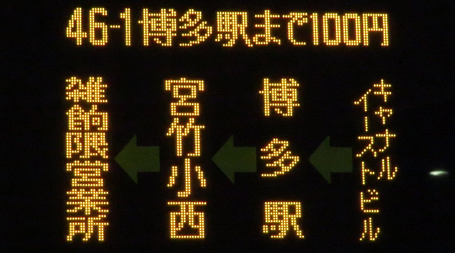| 消滅 |  | 行先: 46-1 雑餉隈営業所 経由地: キャナルイーストビル,博多駅,宮竹小西 表示区間: 春吉→中洲・南新地 撮影日: 2019-05-30 公開日: 2020-05-08 撮影者: nnr_1510 備考: 「博多駅まで100円」表記/2020.03.21改正で消滅(雑餉隈営業所改称に伴い)