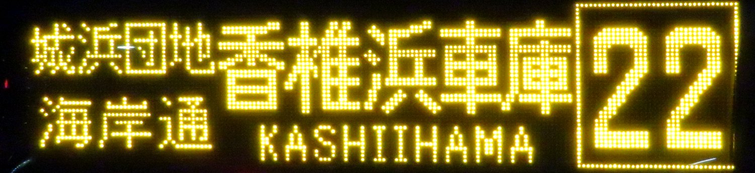 | 現存 |  | 行先: 22 香椎浜車庫 経由地: 城浜団地,海岸通 表示区間: 名島→城浜団地口 撮影日: 2019-05-28 公開日: 2020-05-06 撮影者: nnr_1510 備考: ローマ字表記あり(KASHIIHAMA)