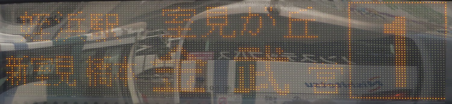 | 現存 |  | 行先: 1 金武営業所 経由地: 姪浜駅北口,野方,橋本駅 表示区間: 藤崎→姪浜(西鉄ストア側) 撮影日: 2019-05-26 公開日: 2020-05-04 撮影者: nnr_1510 備考: ドット欠け