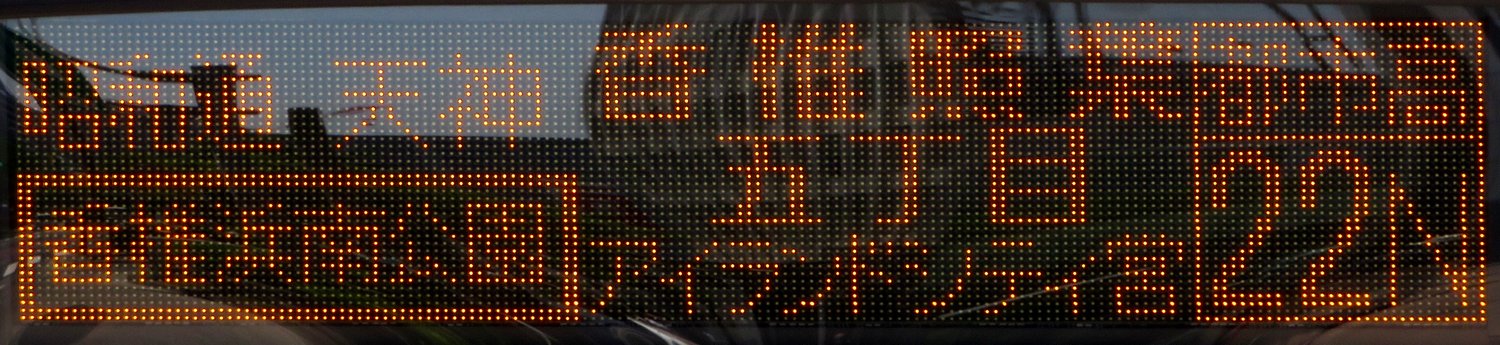 | 現存 |  | 行先: 22N 都市高 香椎浜南公園・香椎照葉五丁目 経由地: 昭和通,天神,香椎浜南公園 表示区間: 大濠公園→天神三丁目(17) 撮影日: 2019-05-26 公開日: 2020-05-04 撮影者: nnr_1510 備考: 香椎浜南公園前経由便/「香椎浜南公園」囲み表記/「アイランドシティ営」表記