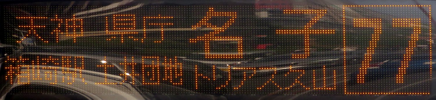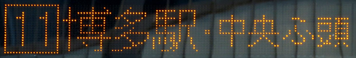 | 現存 |  | 行先: 11 博多港国際ターミナル(中央ふ頭) 経由地: 博多駅 表示区間: 能古渡船場→薬院大通り(西鉄旅行前) 撮影日: 2019-05-26 公開日: 2020-05-04 撮影者: nnr_1510 備考: 中点表記