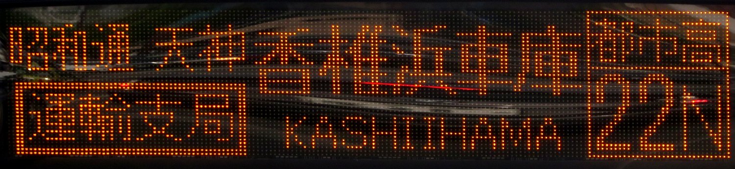 | 現存 |  | 行先: 22N 都市高 運輸支局・香椎浜車庫 経由地: 昭和通,天神,運輸支局 表示区間: 大濠公園→天神三丁目(17) 撮影日: 2019-05-25 公開日: 2020-05-02 撮影者: nnr_1510 備考: 運輸支局経由便/「運輸支局」囲み表記/ローマ字表記あり(KASHIIHAMA)