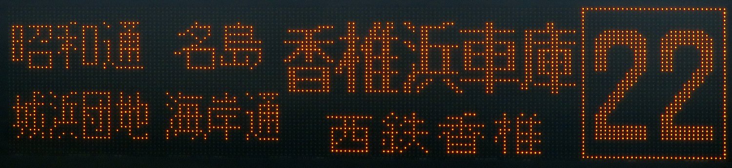 | 現存 |  | 行先: 22 西鉄香椎 経由地: 昭和通,名島,城浜団地,海岸通,香椎浜車庫 表示区間: 大濠公園→蔵本(昭和通)B 撮影日: 2019-05-25 公開日: 2020-05-02 撮影者: nnr_1510 備考: 大濠公園・天神中央郵便局前(18)始発系統のみ表示