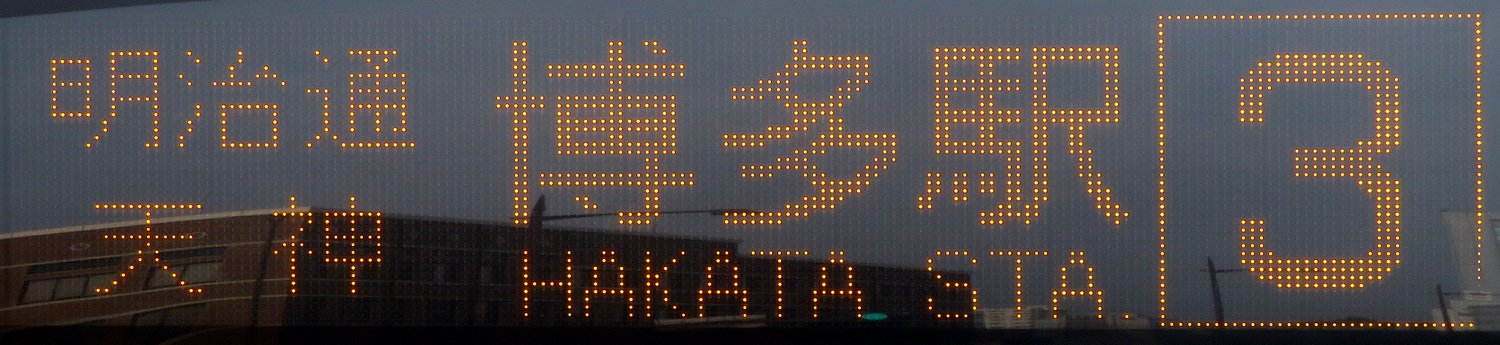| 現存 |  | 行先: 3 博多駅新三井ビル前 経由地: 明治通,天神 表示区間: 西新パレス前→大濠公園 撮影日: 2019-05-25 公開日: 2020-05-03 撮影者: nnr_1510 備考: ローマ字表記あり(HAKATA STA.)