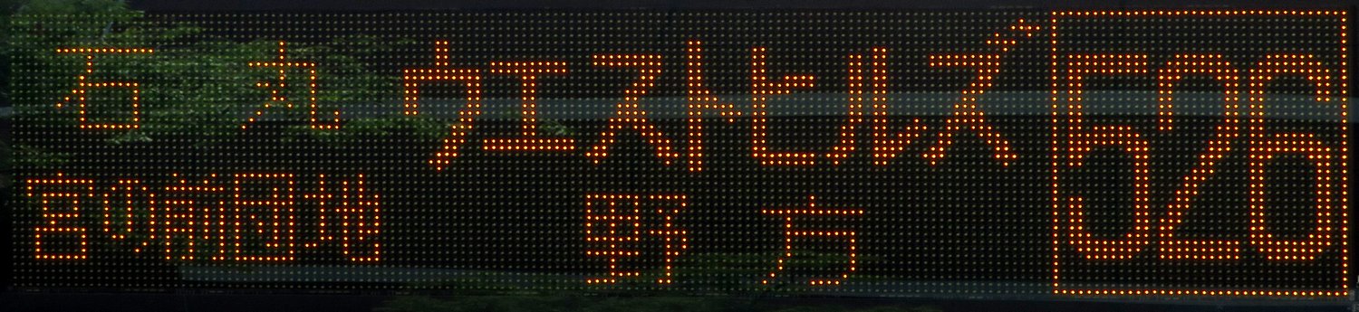 | 現存 |  | 行先: 526 野方(営業所) 経由地: 石丸,宮の前団地,ウエストヒルズ 表示区間: 姪浜駅南口→石丸三丁目 撮影日: 2019-05-23 公開日: 2020-04-30 撮影者: nnr_1510 備考: