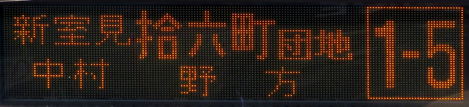 | 現存 |  | 行先: 1-5 野方(営業所) 経由地: 新室見,中村,拾六町団地 表示区間: 姪浜(西鉄ストア側)→石丸新町(新室見) 撮影日: 2019-05-23 公開日: 2020-04-30 撮影者: nnr_1510 備考: