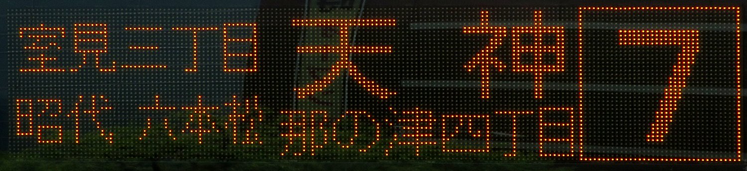 | 現存 |  | 行先: 7 那の津四丁目 経由地: 天神 表示区間: 姪浜駅南口→天神警固神社・三越前 撮影日: 2019-05-23 公開日: 2020-04-30 撮影者: nnr_1510 備考: 中点表記/次の天神高速バスターミナル前(1)よりW3番として運行